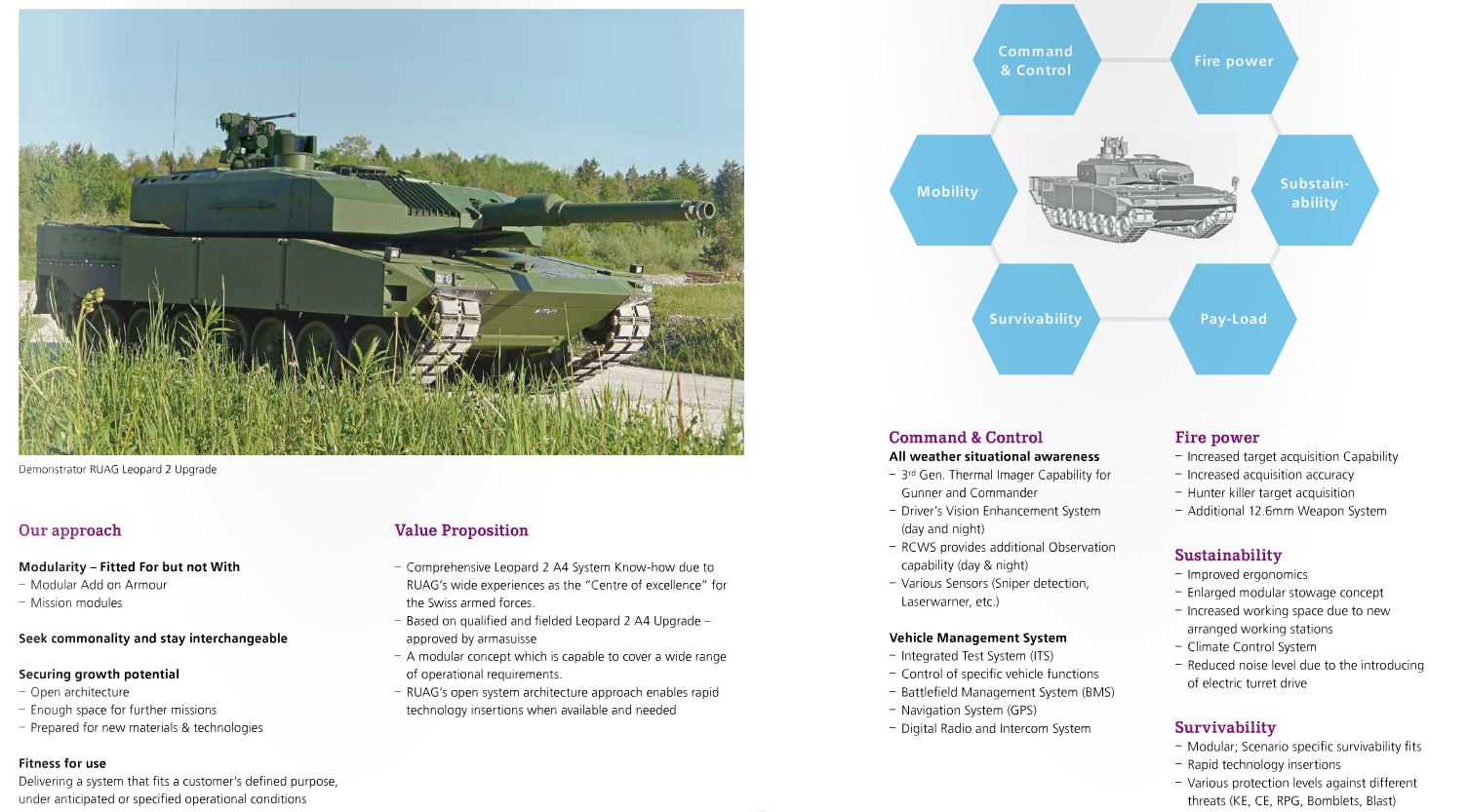 In terms of technology, I'd choose Rheinmetall, General Dynamics or KMW however. Unlike BAE these companies have state-of-the-art products available and do not make most of their living from old 1980s designs such as the Warrior or Bradley. Compared to CMI and Lockheed Martin, all of these companies do have manufacturing capabilities for deeper modifications and upgrades. RUAG is probably comparable, but lacks a wider portfolio and as many successfull contracts as Rheinmetall/KMW/GD.